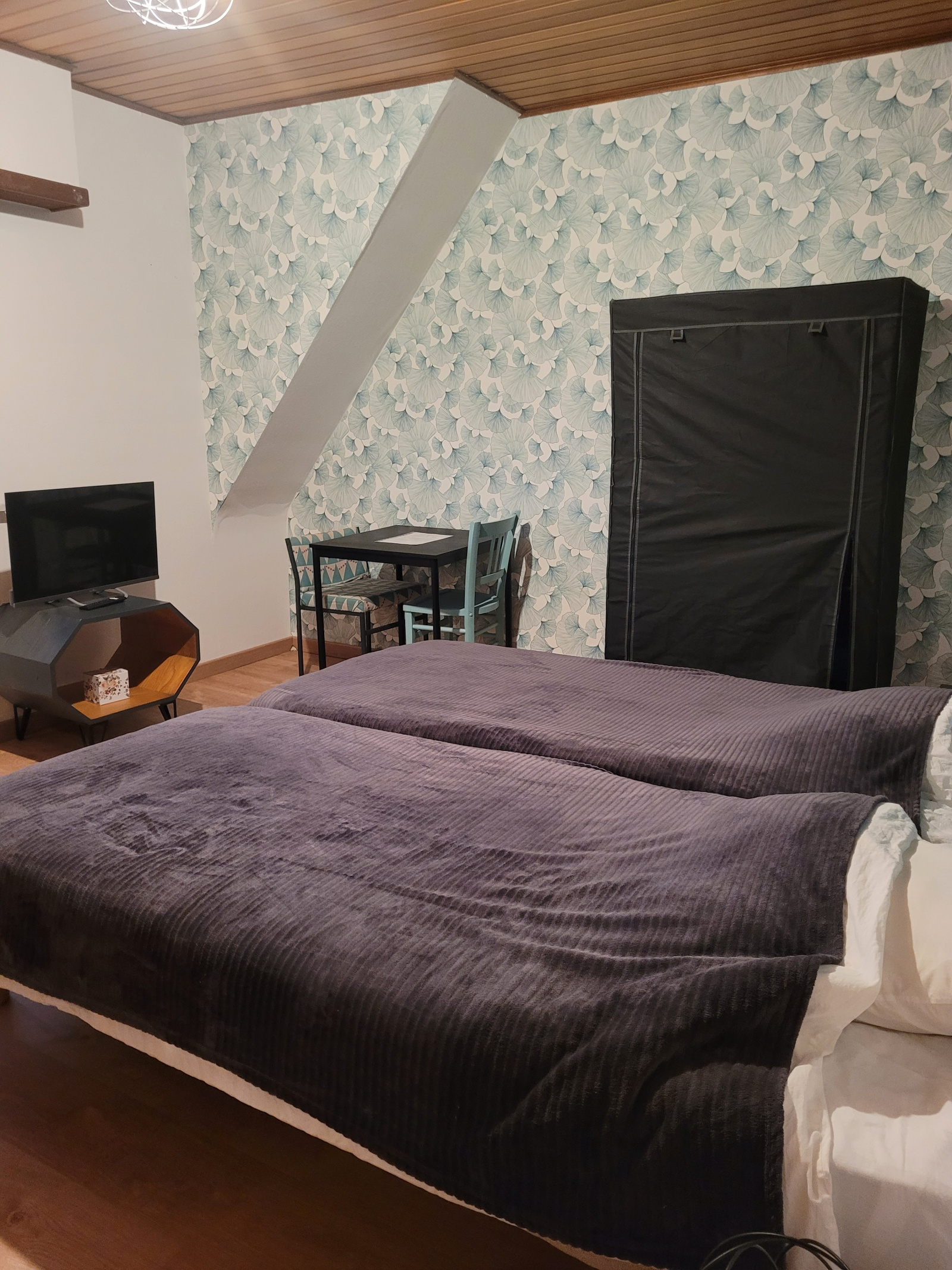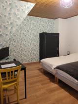 Chambre entièrement équipée avec coin repas, télévision , salle d'eau avec W.C . Cette chambre ce situe au 2ème étage d'un immeuble d'habitation .