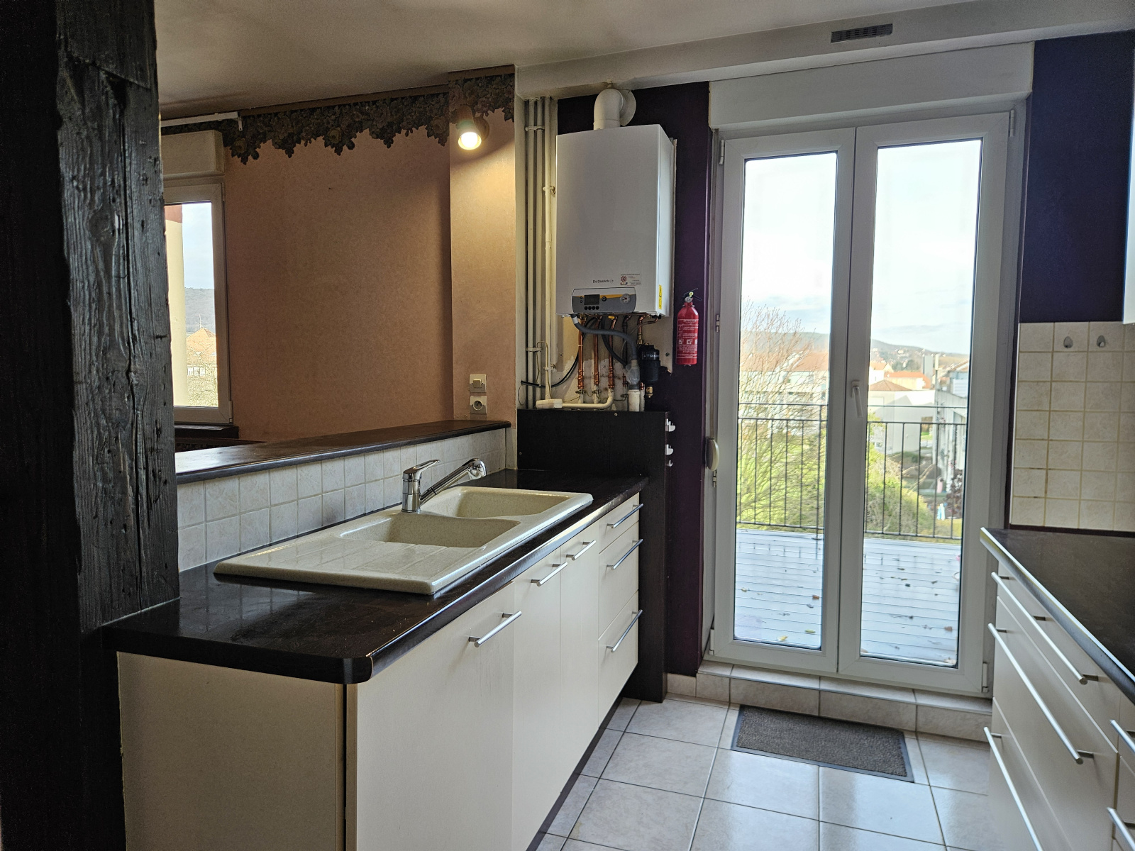 une cuisine équipée neuve avec accès au balcon/terrasse, un séjour, deux chambres à l'étage et une salle de bain.