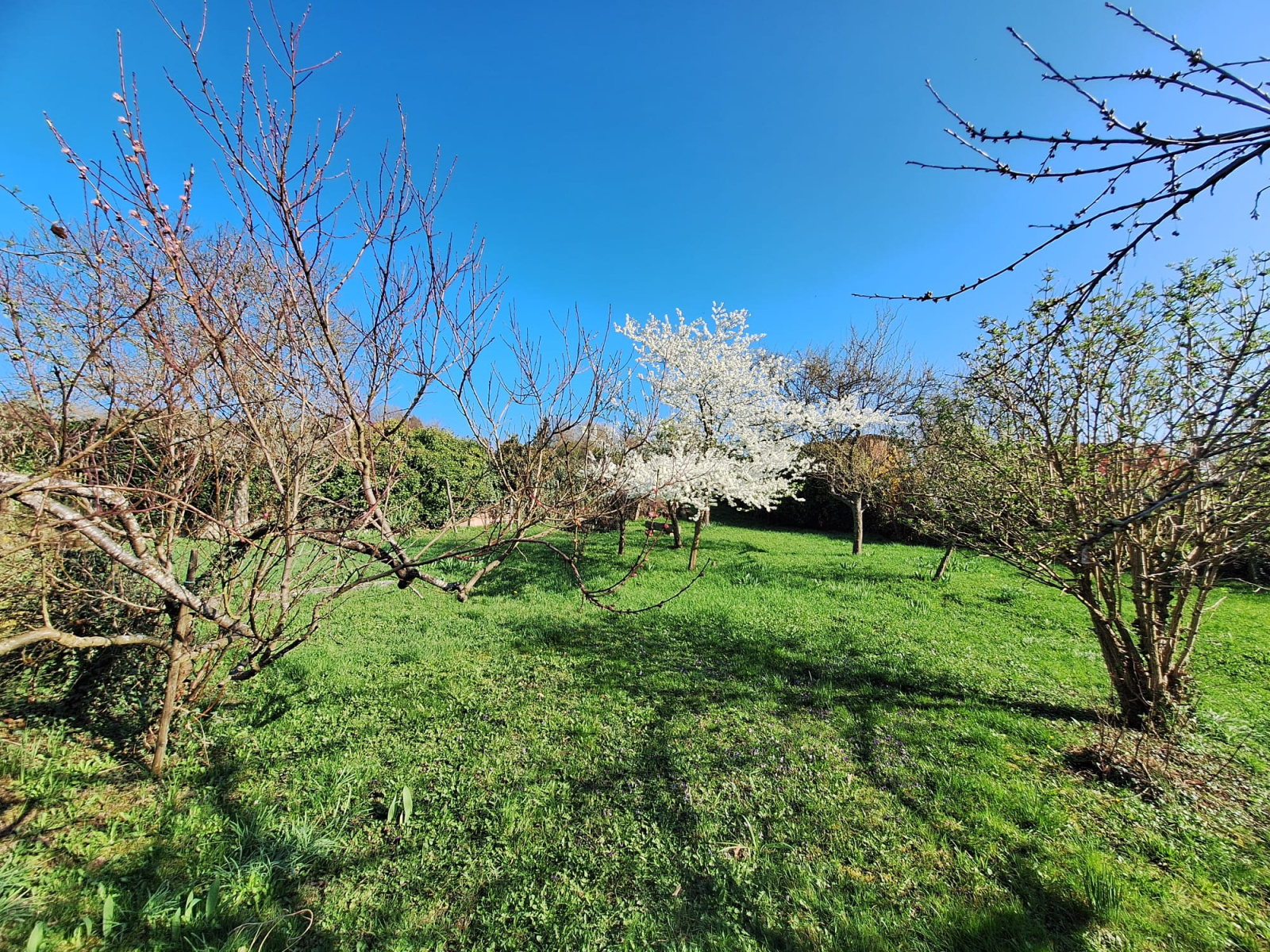 A l’arrière de celle-ci se trouve un agréable espace vert d’environ 400m2 accessible également depuis un chemin rural surplombant le terrain.