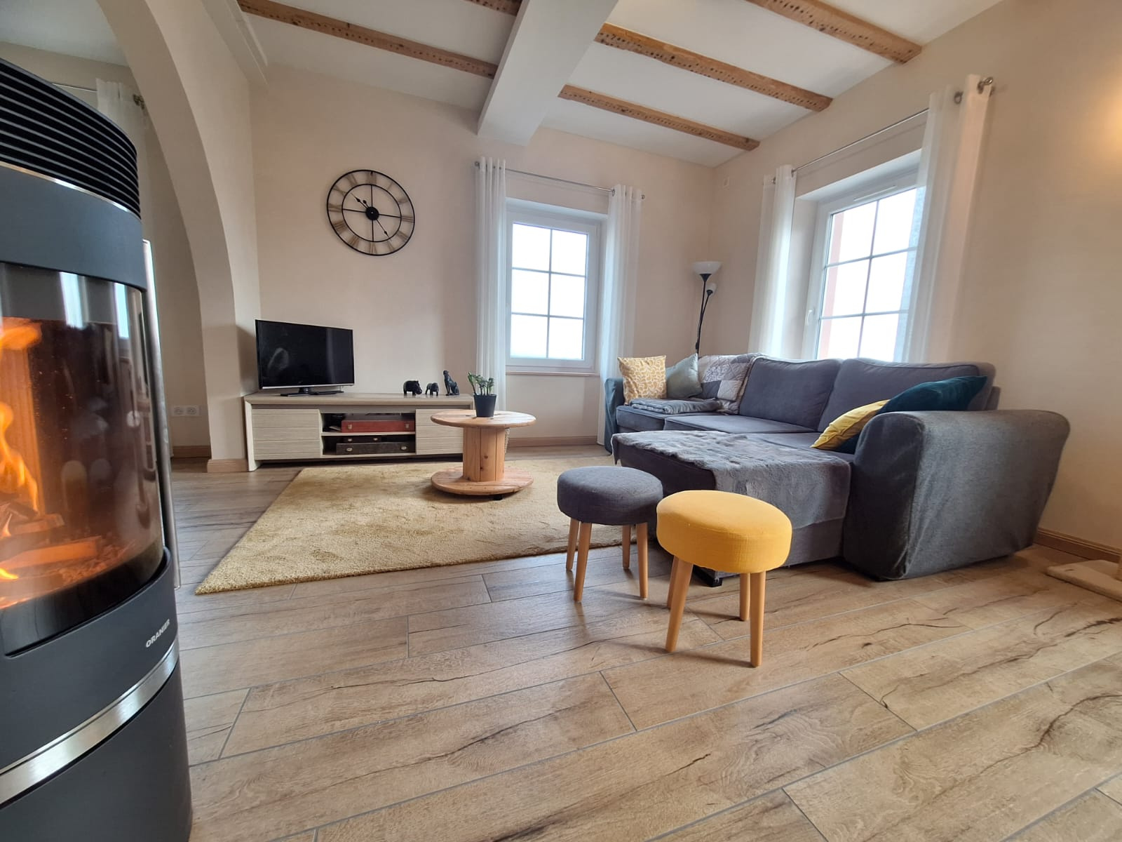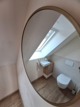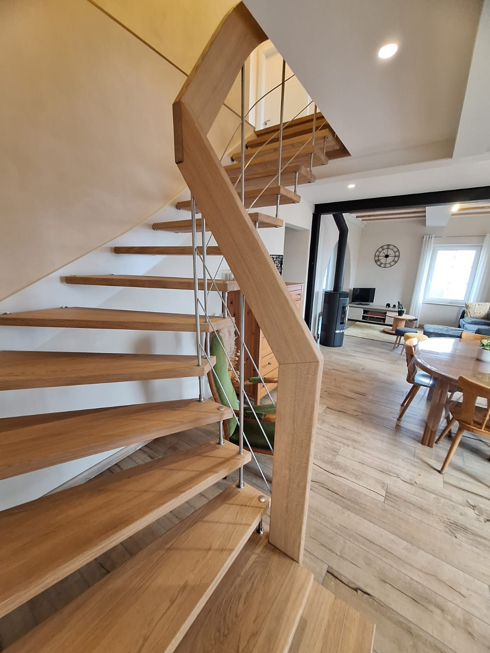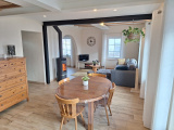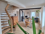 Au niveau inférieur vous trouverez une entrée, un grand séjour d’environ 40 m2 agrémenté d’un poêle à bois, un dégagement, un WC séparé, une salle d’eau avec douche à l’italienne et une cuisine entièrement équipée qui donne sur une entrée à l’arrière dans laquelle se trouve un espace buanderie / penderie.