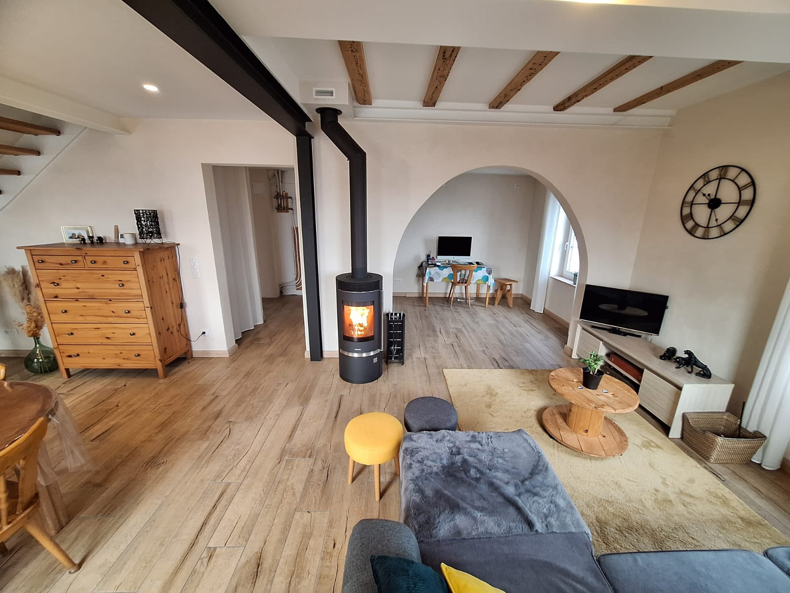 Chauffage au sol au rez-de-chaussée, radiateurs à l’étage, alimentés par une pompe à chaleur.