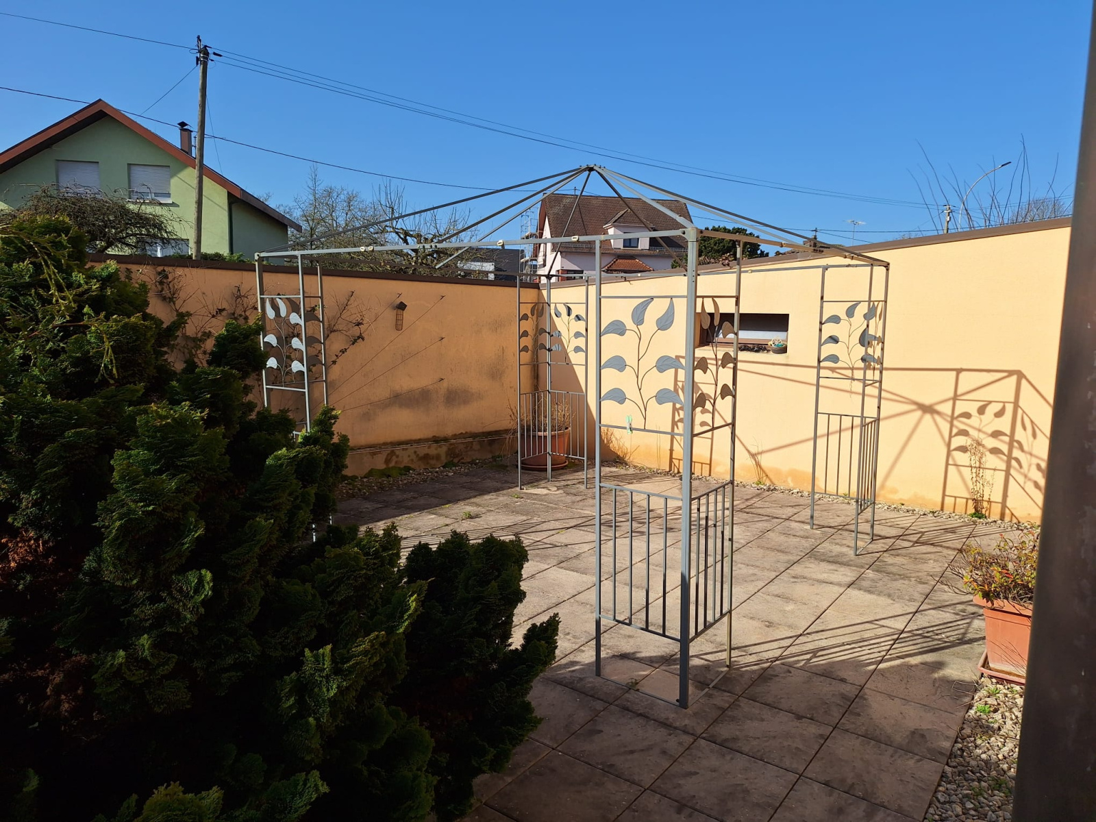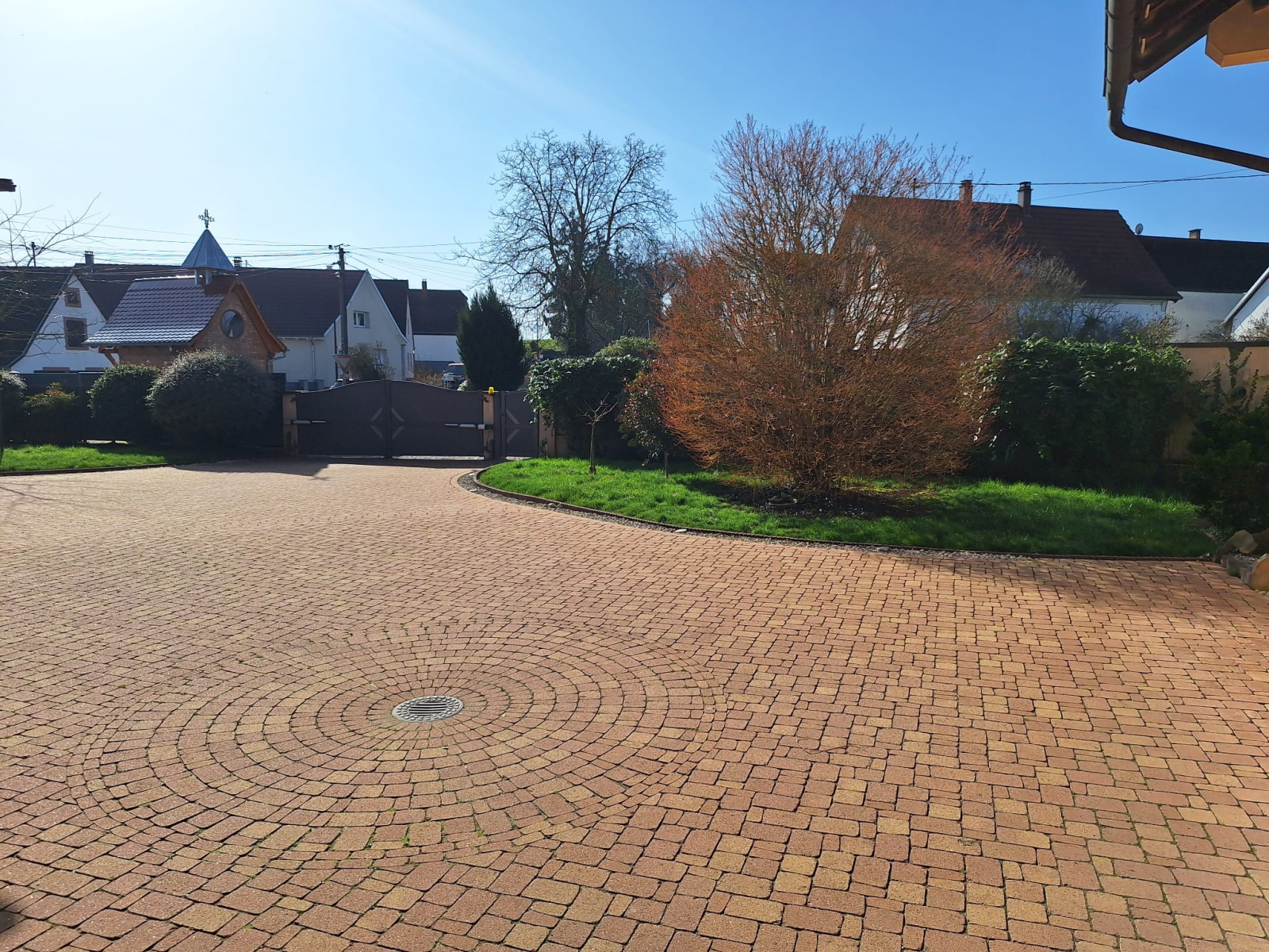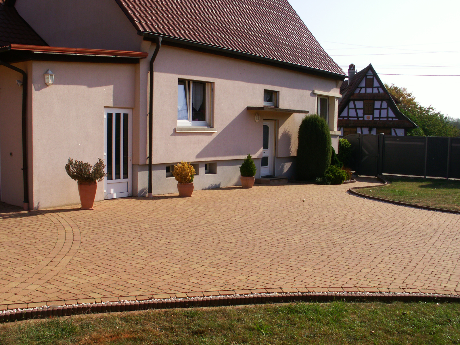 Cour entièrement pavée, portail électrique.