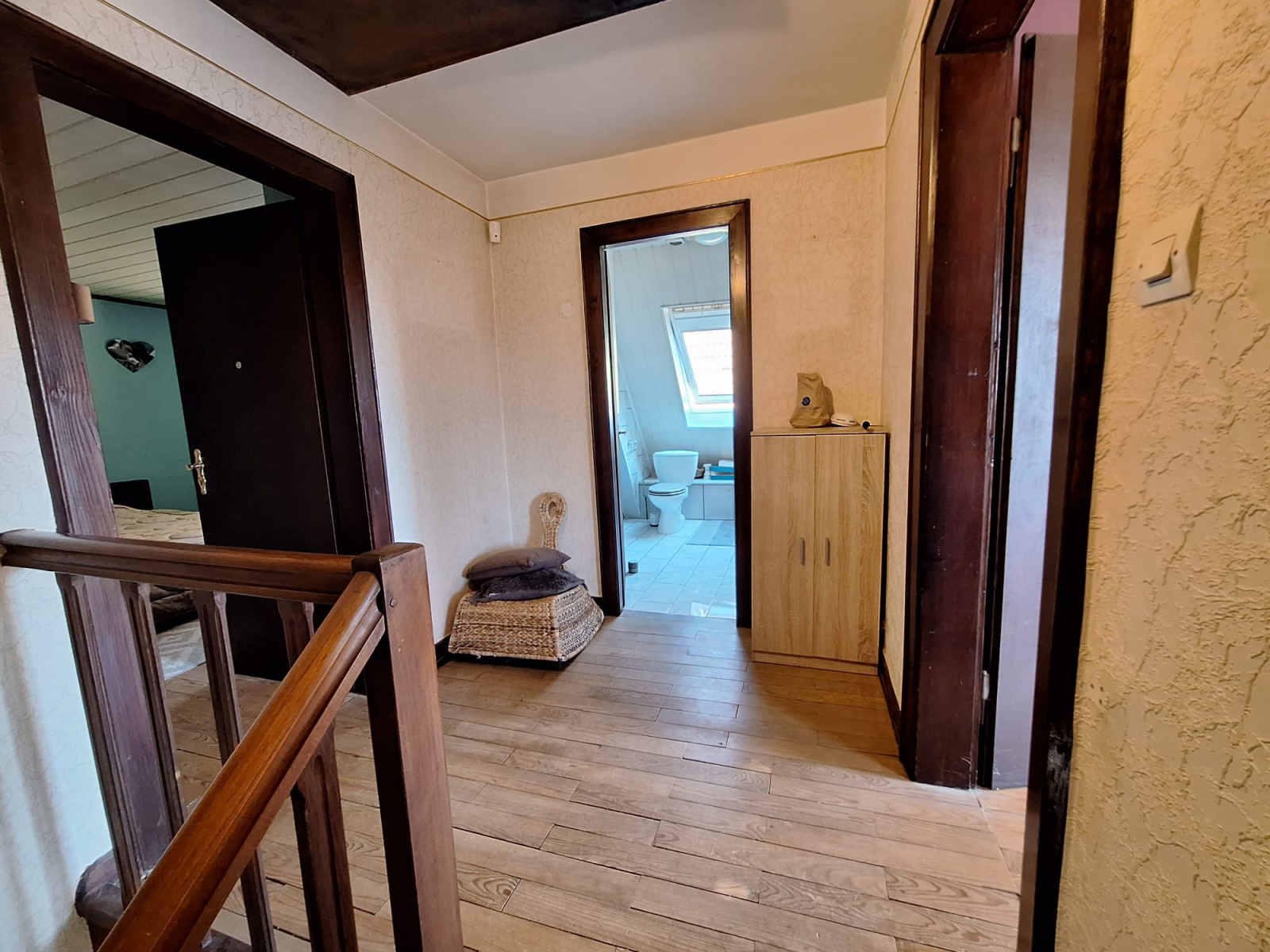 A l'étage, un palier, 2 chambres et une salle de bain avec WC.
