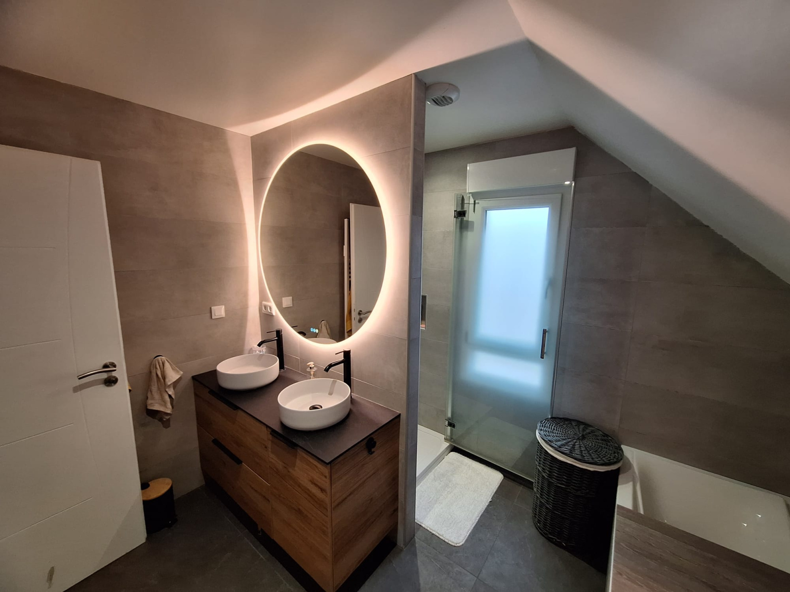 A l’étage, 3 chambres dont l’une avec espace dressing, une salle de bains avec douche à l’italienne, baignoire, WC et double vasque.